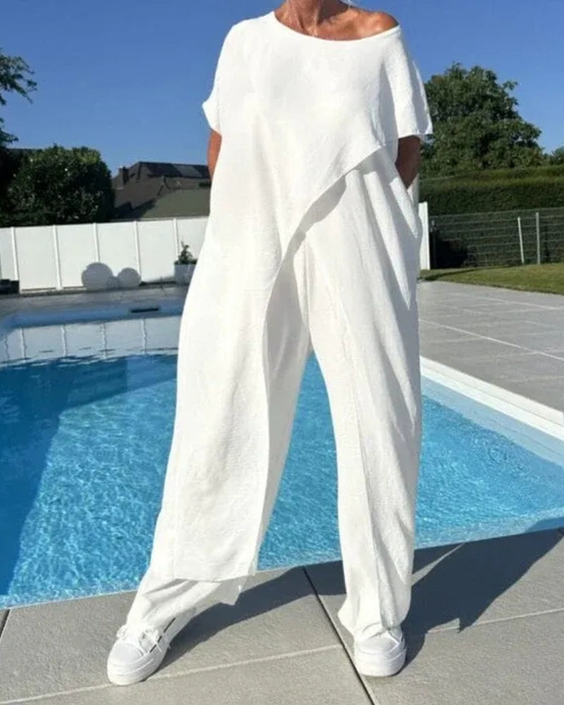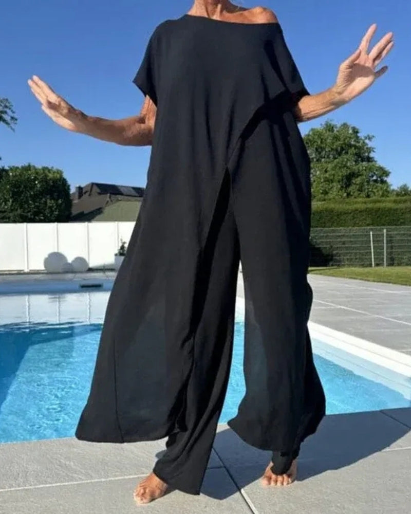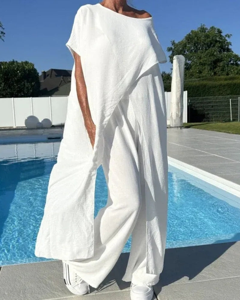Its asymmetrical drape top and fluid wide-leg pants create a silhouette that’s both flattering and free. Crafted from airy, breathable fabric, it’s perfect for warm days, relaxed evenings, and everything in between.